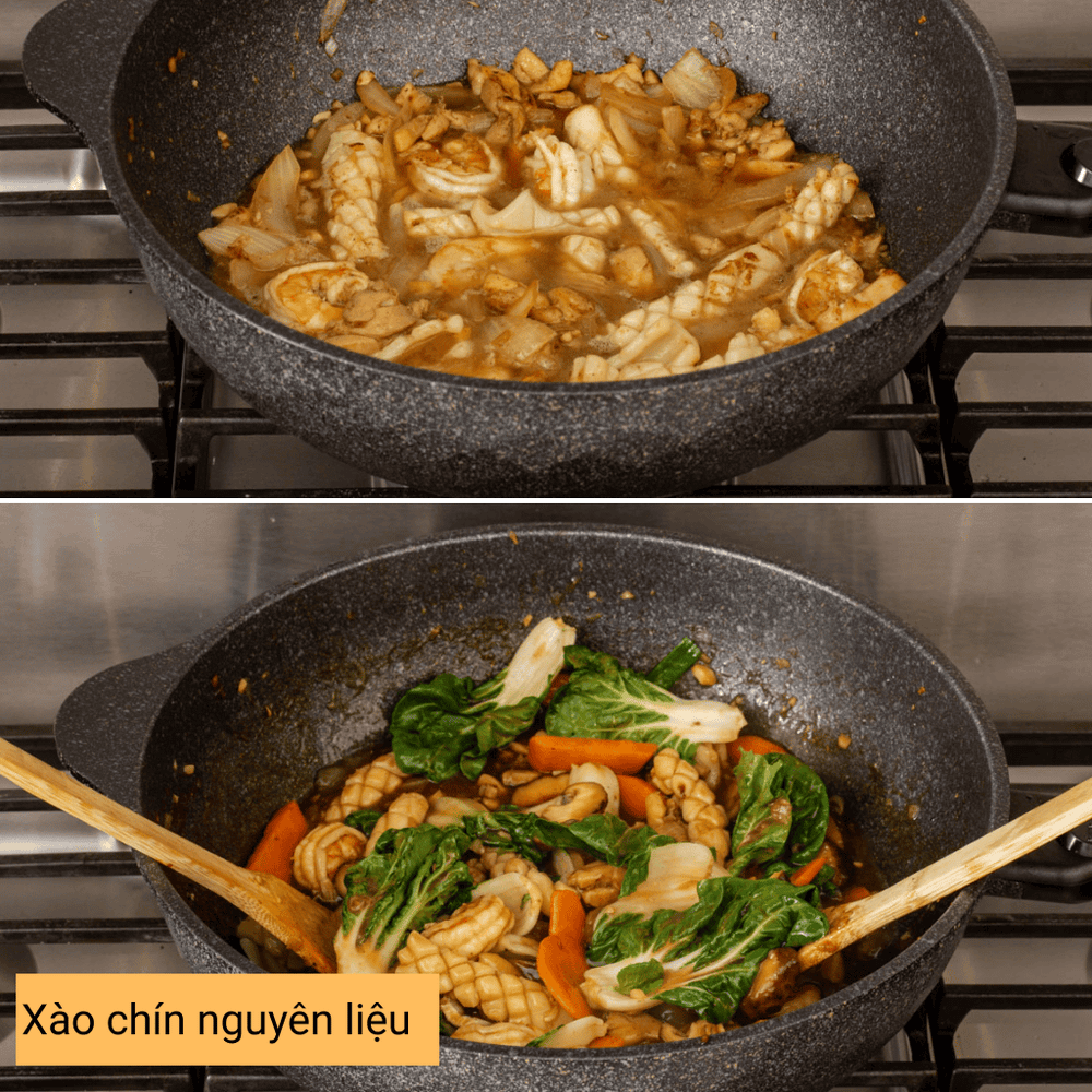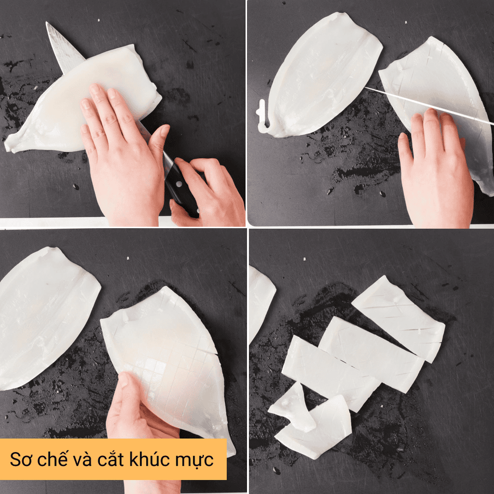 Mực sau khi rửa sạch, cắt nhỏ từng miếng vừa ăn, khứa đường rãnh lên mực để thấm gia vị và chín đều từ bên trong.