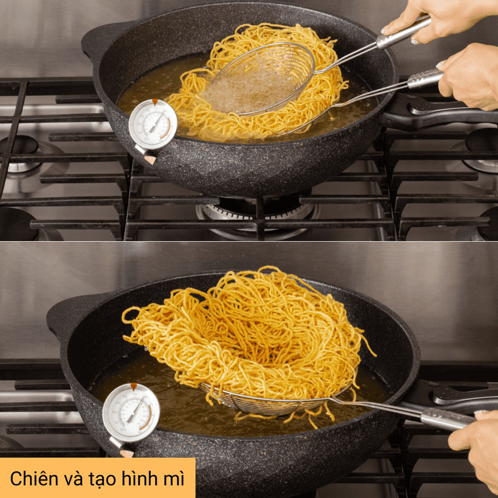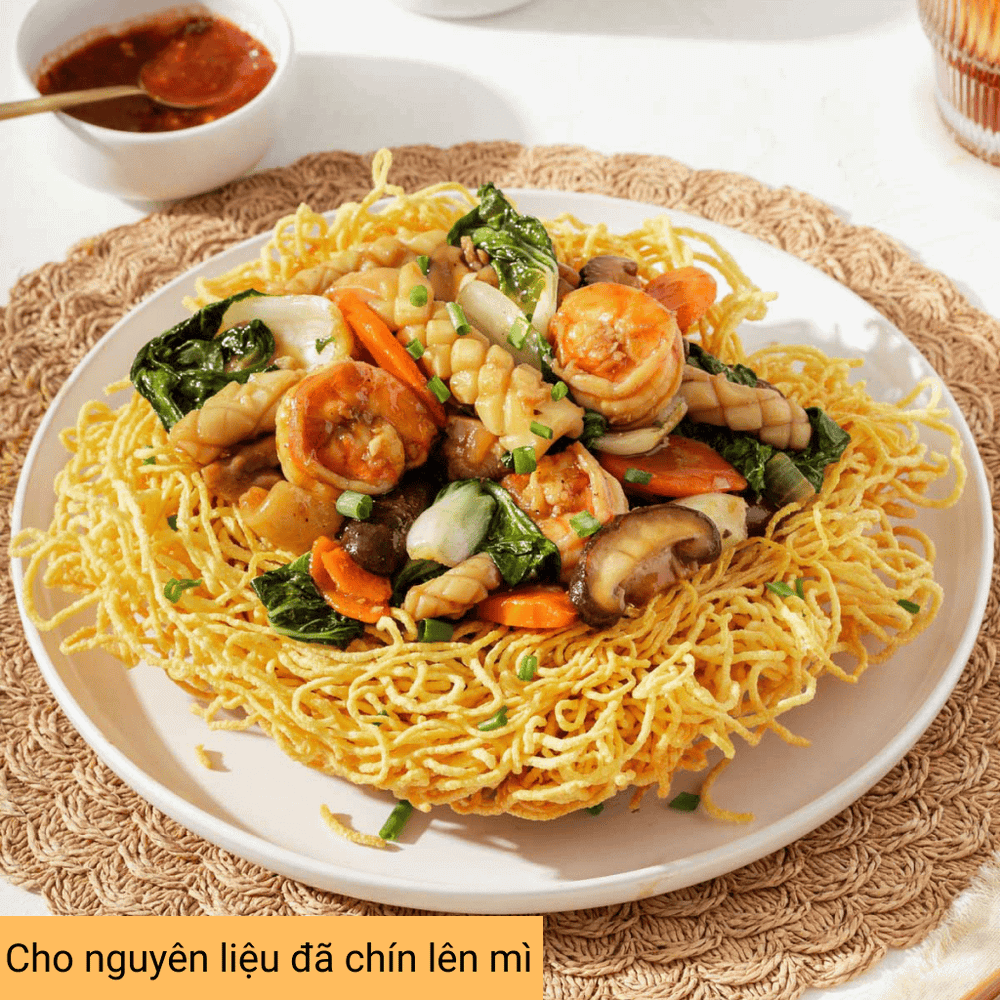 Chia mì thành các phần vừa ăn, thả từng phần vào chảo dầu nóng và chiên đến khi mì giòn, vàng đều thì vớt ra để ráo dầu.