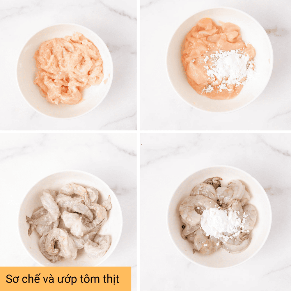 Thịt bò rửa sạch, thái lát. Tôm bóc vỏ, lấy chỉ lưng. Cả tôm và thịt bò nêm thêm 1 ít muối và tiêu cho thấm gia vị.