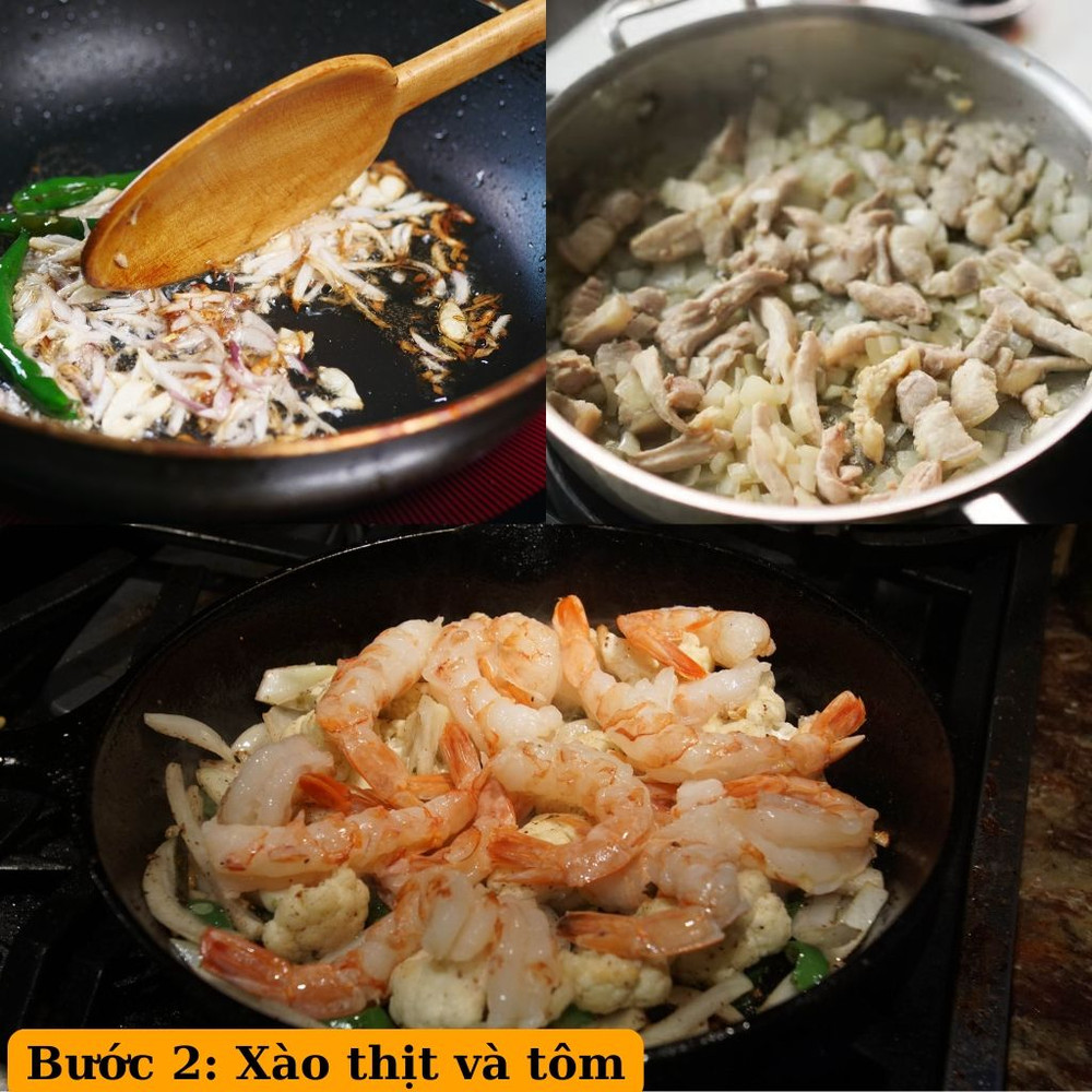 Phi thơm tỏi băm, sau đó cho thịt vào xào nhanh nêm chút dầu hào đến khi thịt chín mềm, rồi đổ ra đĩa. Tiếp tục xào tôm với chút hạt nêm cho tôm săn lại, đổ tôm ra đĩa.