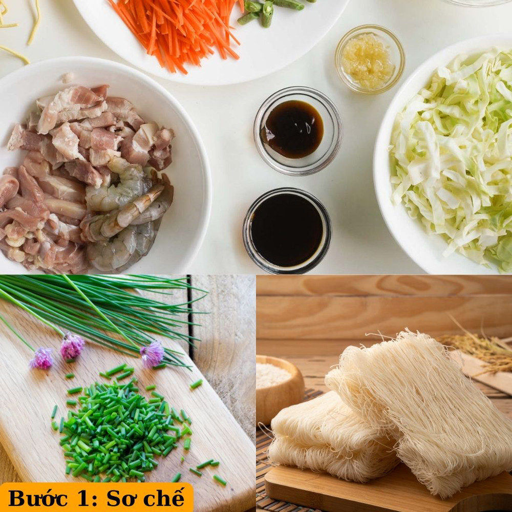 Ngâm miến trong nước 15 phút sau đó vớt ra, để ráo. Thịt bò thái mỏng, tôm tươi rửa sạch, để ráo nước. Nấm hương, cà rốt, cải ngọt và hành lá cắt miếng vừa ăn.