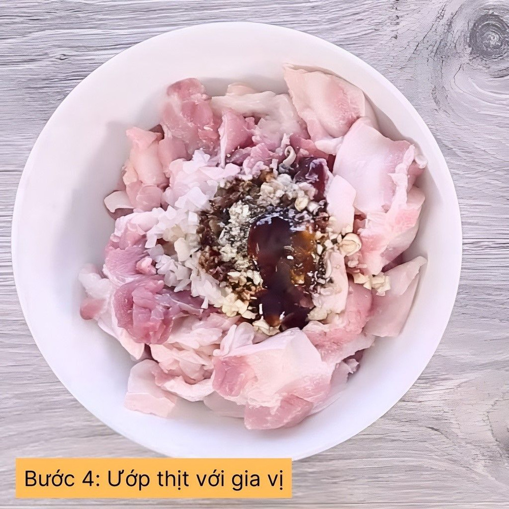 Cho thịt ba rọi vào ướp cùng với nước mắm, đường, muối và tiêu. Để thịt ngấm gia vị khoảng 15 phút.