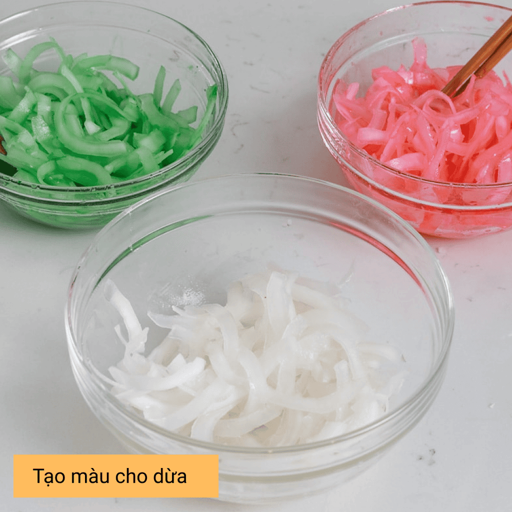Chia dừa thành 3 phần, cho nước lá dứa và nước gấc để tạo màu cho mứt dừa.