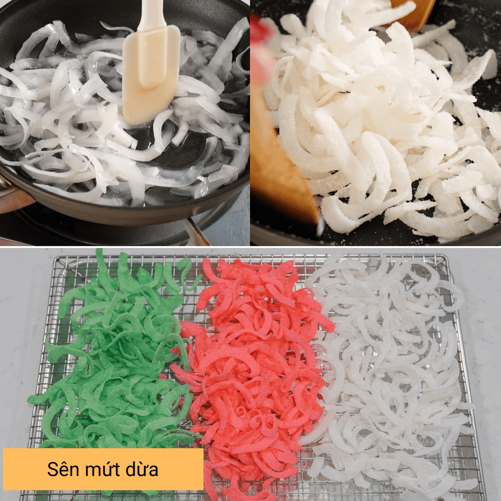 Cho đường, nước, nước cốt dừa và muối vào khuấy đều, sau đó đun cho đường tan hoàn toàn. Tiếp đó cho dừa đã nạo vào nồi nước đường, khuấy đều và để ngâm khoảng 30 phút cho dừa thấm đường.