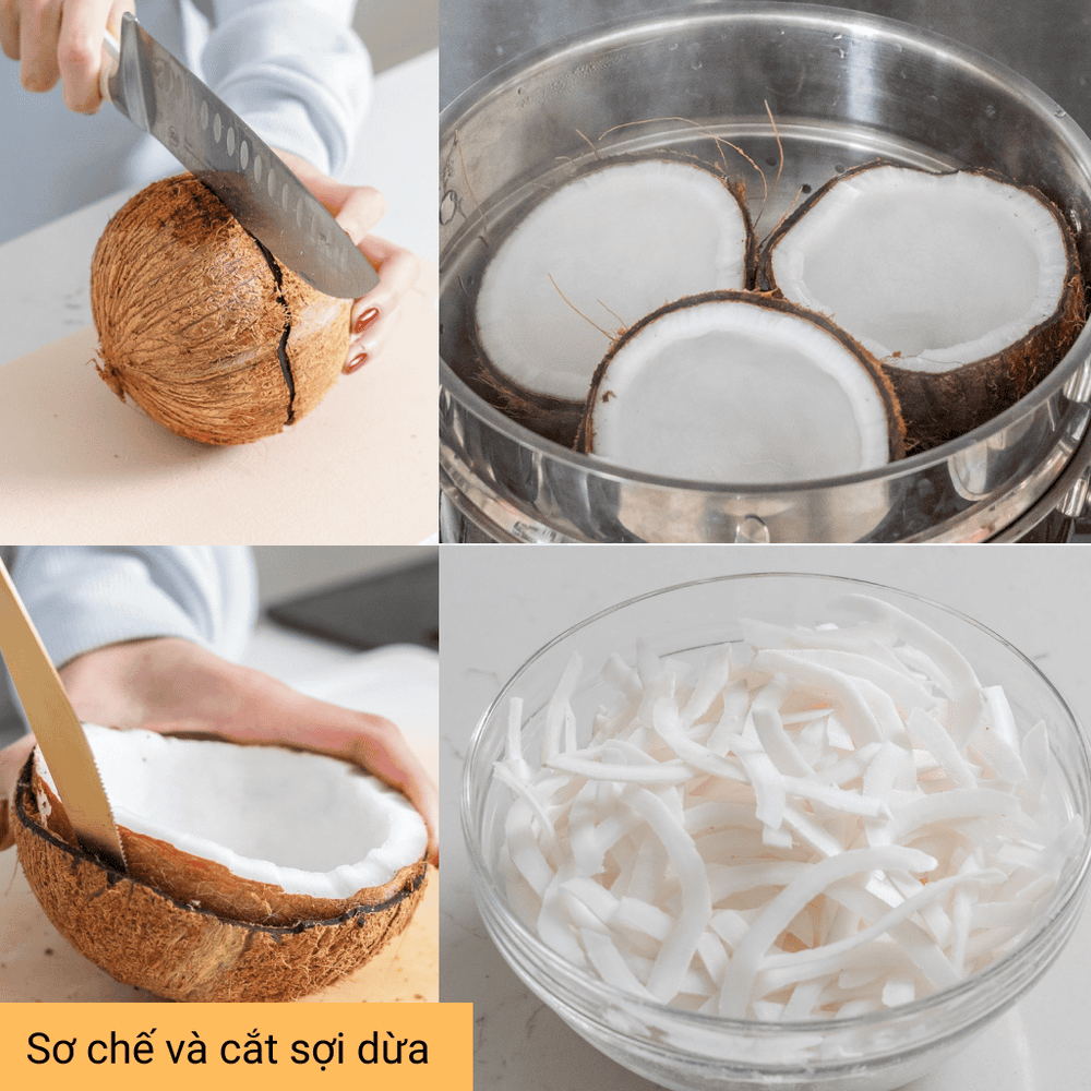 Cắt đôi quả dừa. Sau khi chần sơ qua với nước sôi thì tiến hành lấy cơm dừa. Cắt thành từng sợi vừa ăn.
