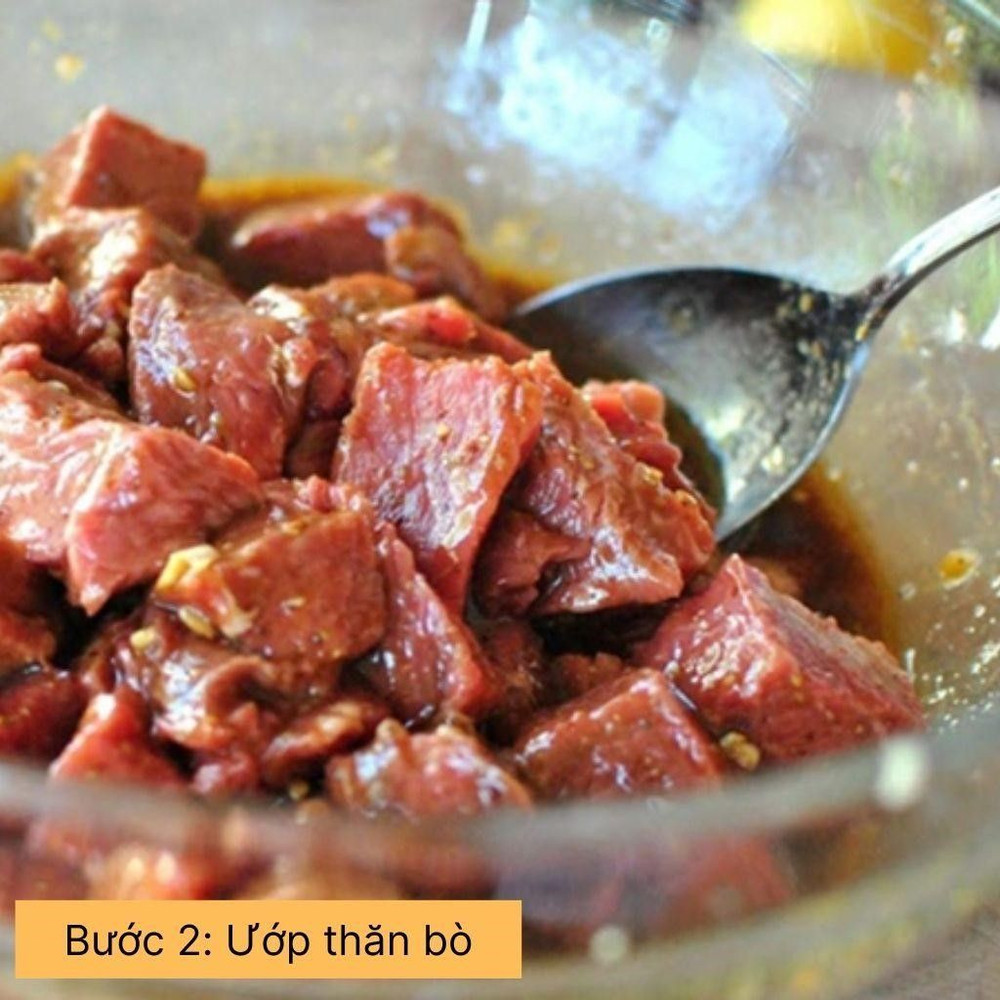 Cho thịt bò vào tô, thêm dầu hào, nước tương và một ít tiêu xay. Trộn đều và để thịt nghỉ trong 10 phút để gia vị thấm vào thịt, tạo vị đậm đà khi nấu.