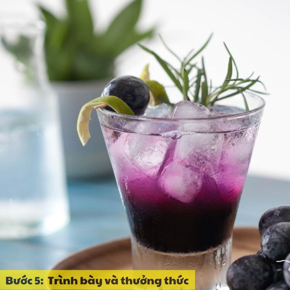 Khuấy đều và thưởng thức ngay để cảm nhận vị chua ngọt của nho và chanh, hòa quyện cùng soda mát lạnh.