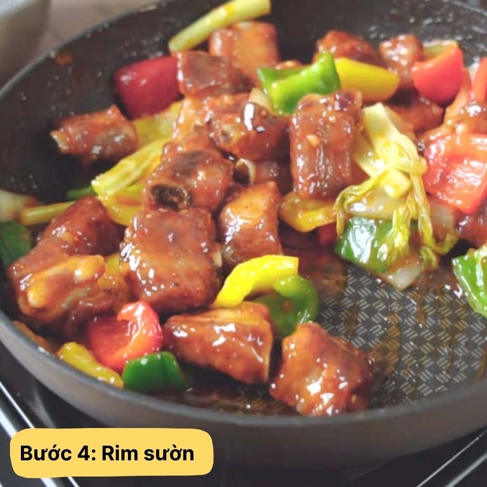 Khi sườn chín vàng, thêm hành tây cùng ớt chuông và hỗn hợp gia vị vào xào chung. Rim 5-7 phút cho nước sốt thấm đều vào sườn, để lửa nhỏ