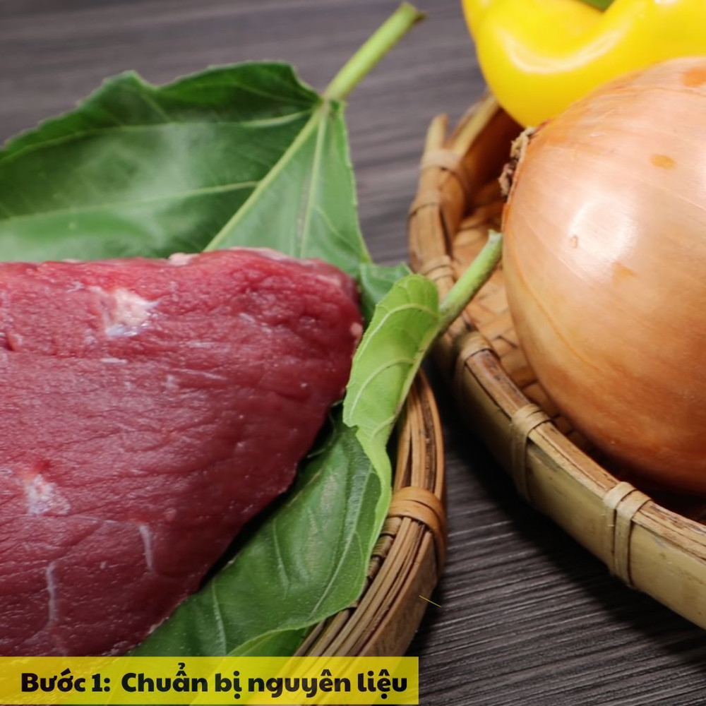 Thăn bò thái lát mỏng, hành tây cắt múi cau. Băm nhỏ tỏi và hành tím.