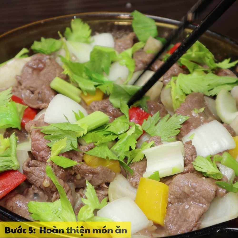 Cho thăn bò đã xào vào lại chảo, đảo đều với hành tây thêm 1-2 phút, nêm nếm gia vị nếu cần. Sau đó, tắt bếp và dọn món ra đĩa.