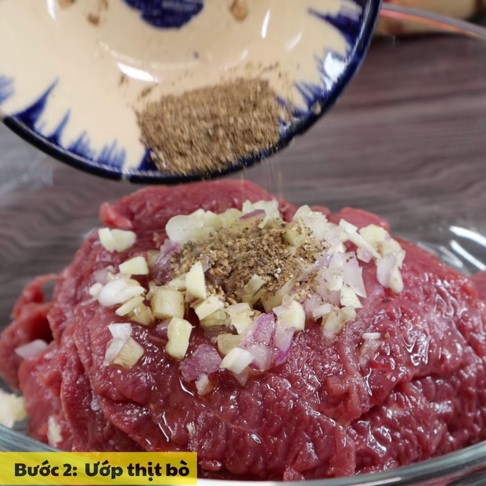 Ướp thăn bò với nước mắm, tiêu và tỏi băm trong khoảng 10-15 phút để thấm gia vị.