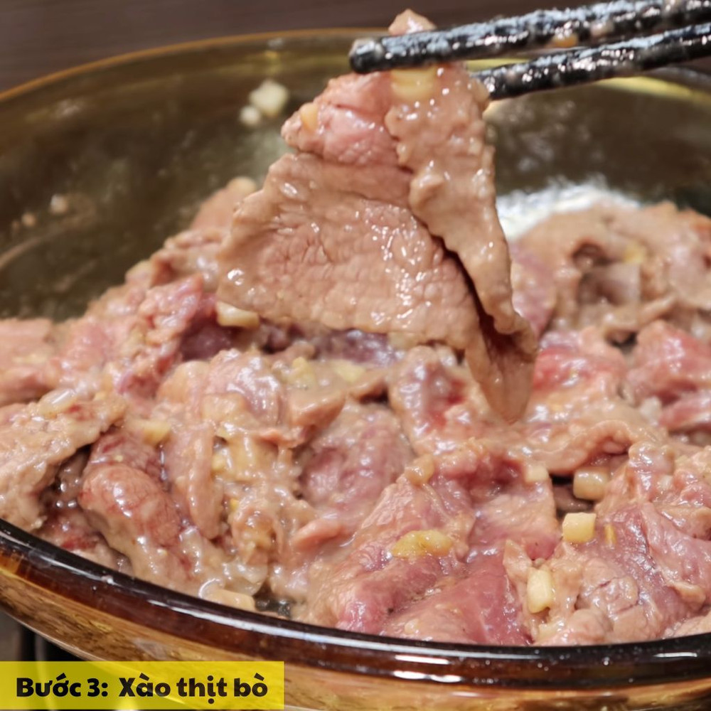 Làm nóng chảo với dầu ăn, phi thơm hành tím và tỏi băm. Sau đó cho thăn bò vào xào nhanh trên lửa lớn, đảo đều đến khi thịt vừa chín tới, rồi vớt ra đĩa.