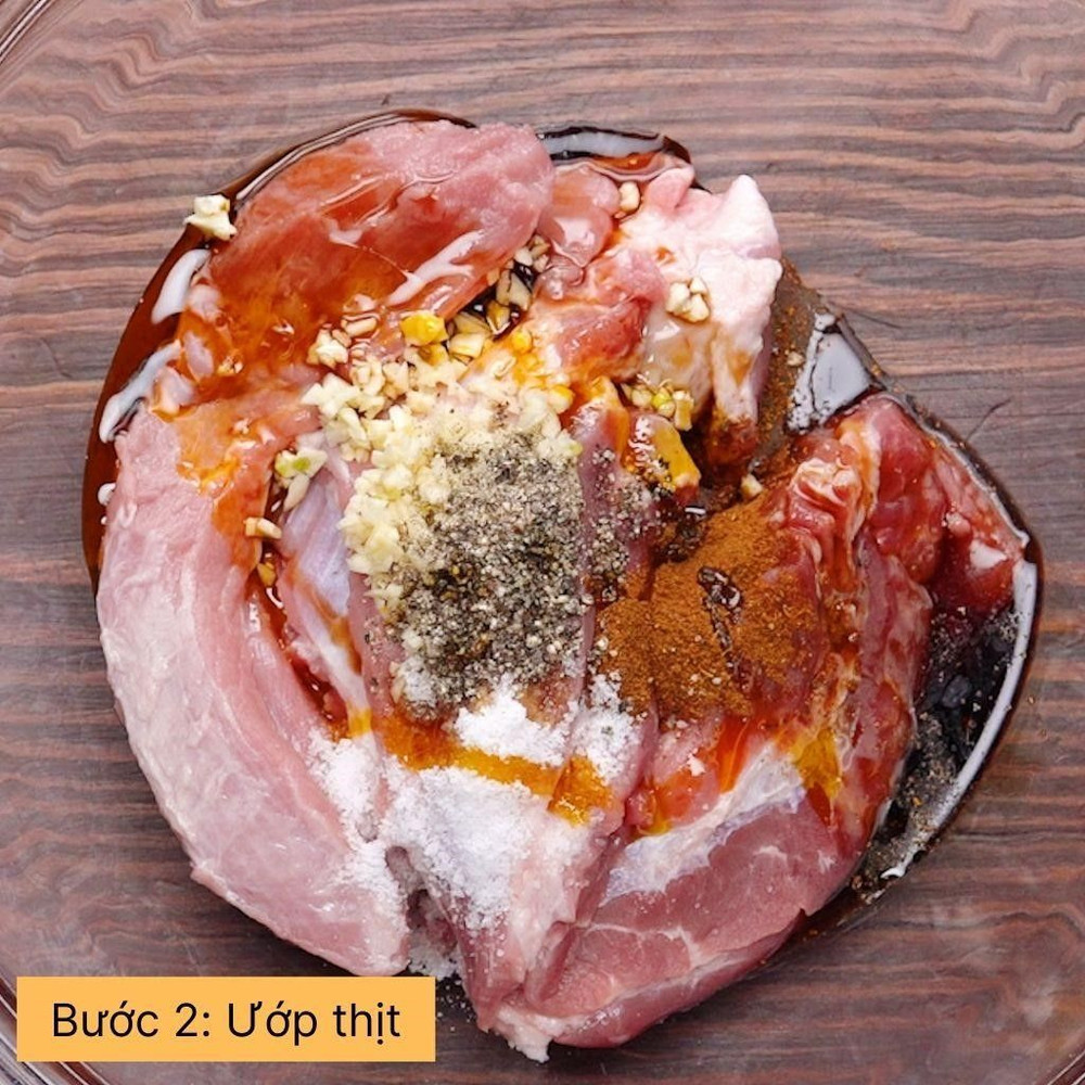 Cho tỏi băm, hành tím băm, dầu hào, xì dầu, mật ong, đường, ngũ vị hương, dầu mè, rượu mai quế lộ, hạt nêm, nước mắm, và tiêu vào tô, trộn đều. Ướp thịt với hỗn hợp gia vị này trong ít nhất 1 giờ để thấm vị.