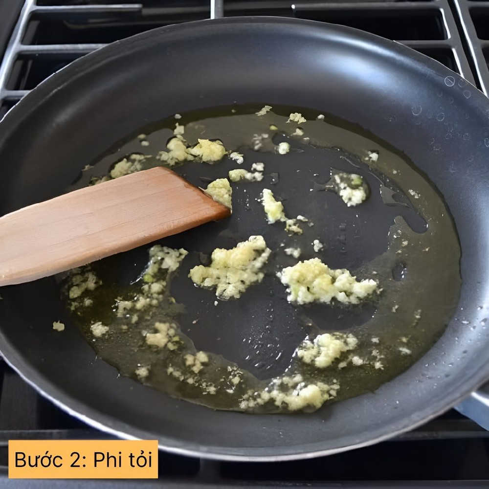 Cho tỏi đã băm nhuyễn vào chảo, đảo đều liên tục để tỏi không bị cháy. Khi tỏi chuyển sang màu vàng nâu và tỏa mùi thơm, dùng muỗng vớt ra để ra·