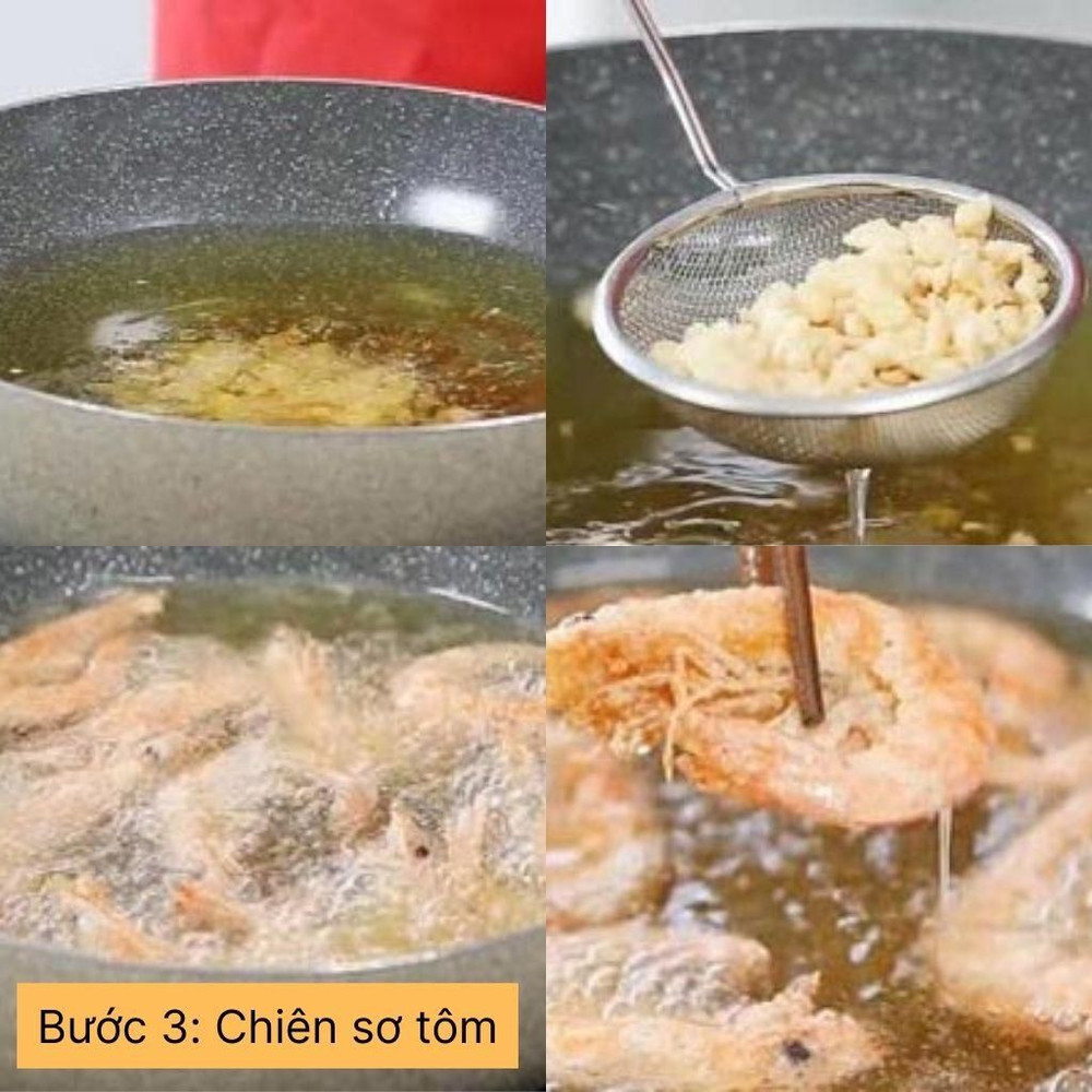 Vớt tỏi phi ra. Sử dụng lại chảo, cho tôm vào chiên sơ.