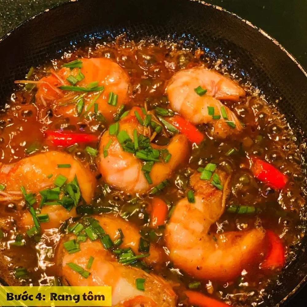Cho tôm vào chảo, rang với lửa vừa cho đến khi tôm chuyển sang màu đỏ cam. Sau đó, đổ nước sốt me đã pha vào chảo, đảo đều để tôm thấm gia vị.