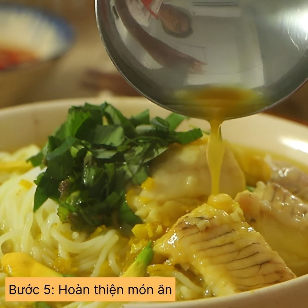 Thêm bún tươi, cá lóc đã nấu chín lên trên, chan nước dùng và rắc hành lá, ngò rí lên bề mặt.