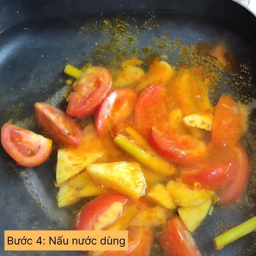 Phi thơm hành tím và cho cà chua, dứa (thơm) vào xào. Sau đó đổ hỗn hợp vào nồi nước dùng. Khi nước sôi lại, nêm nước mắm, muối, đường cho vừa vị.
