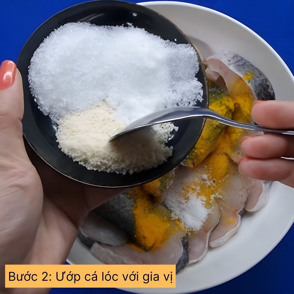 Ướp cá với muối, nghệ, tỏi băm, ớt trong 15 phút để thấm đều gia vị.
