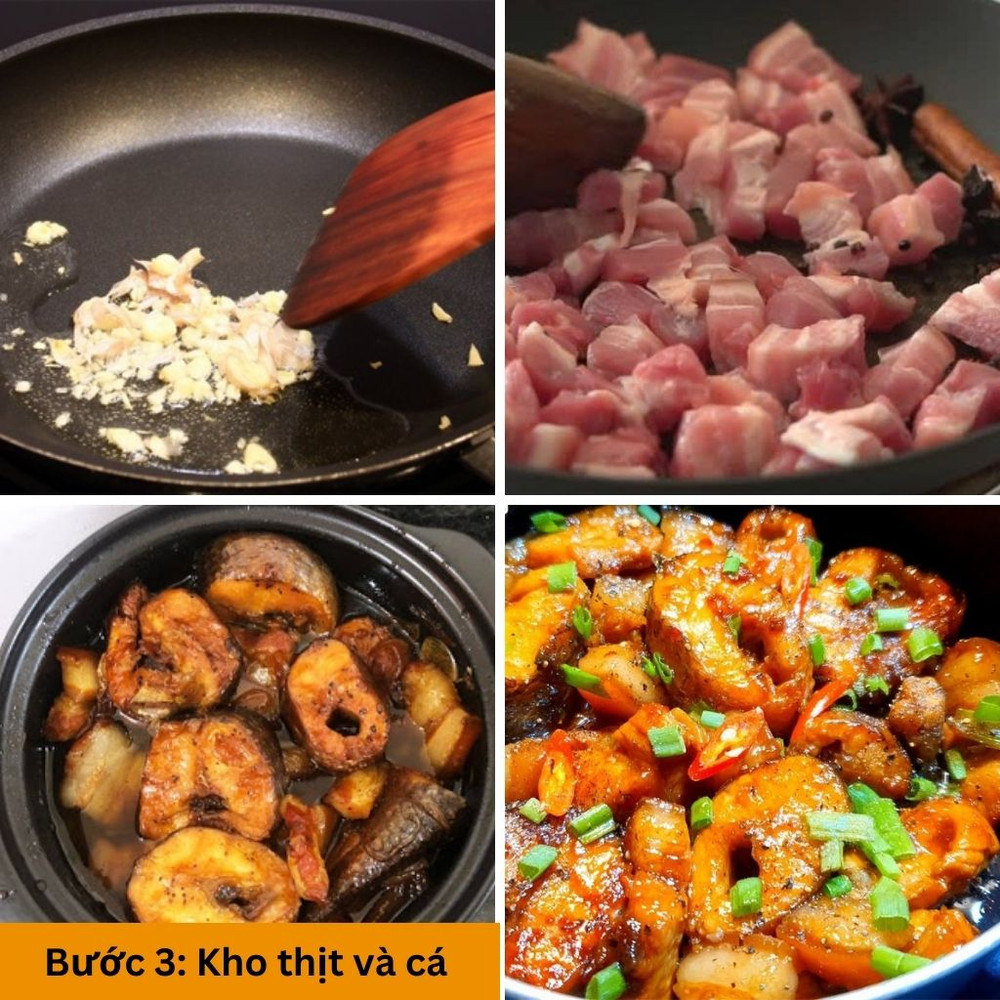 Cho thịt ba chỉ vào chảo nóng, đảo đều đến khi thịt săn lại rồi cho cá vào. Sau đó cho nước lọc, nước mắm, đường, tiêu để lửa nhỏ và kho.