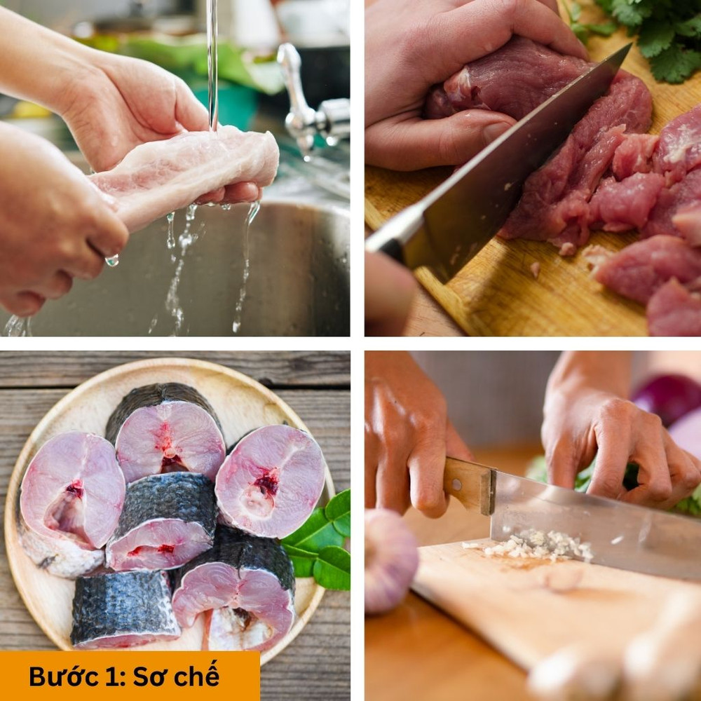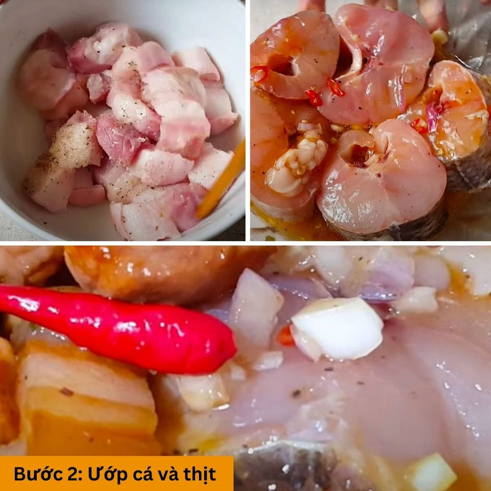 Thịt ba chỉ và cá rửa sạch, cắt thành miếng vừa ăn sau đó để ráo nước. Hành tím, tỏi, ớt băm nhuyễn