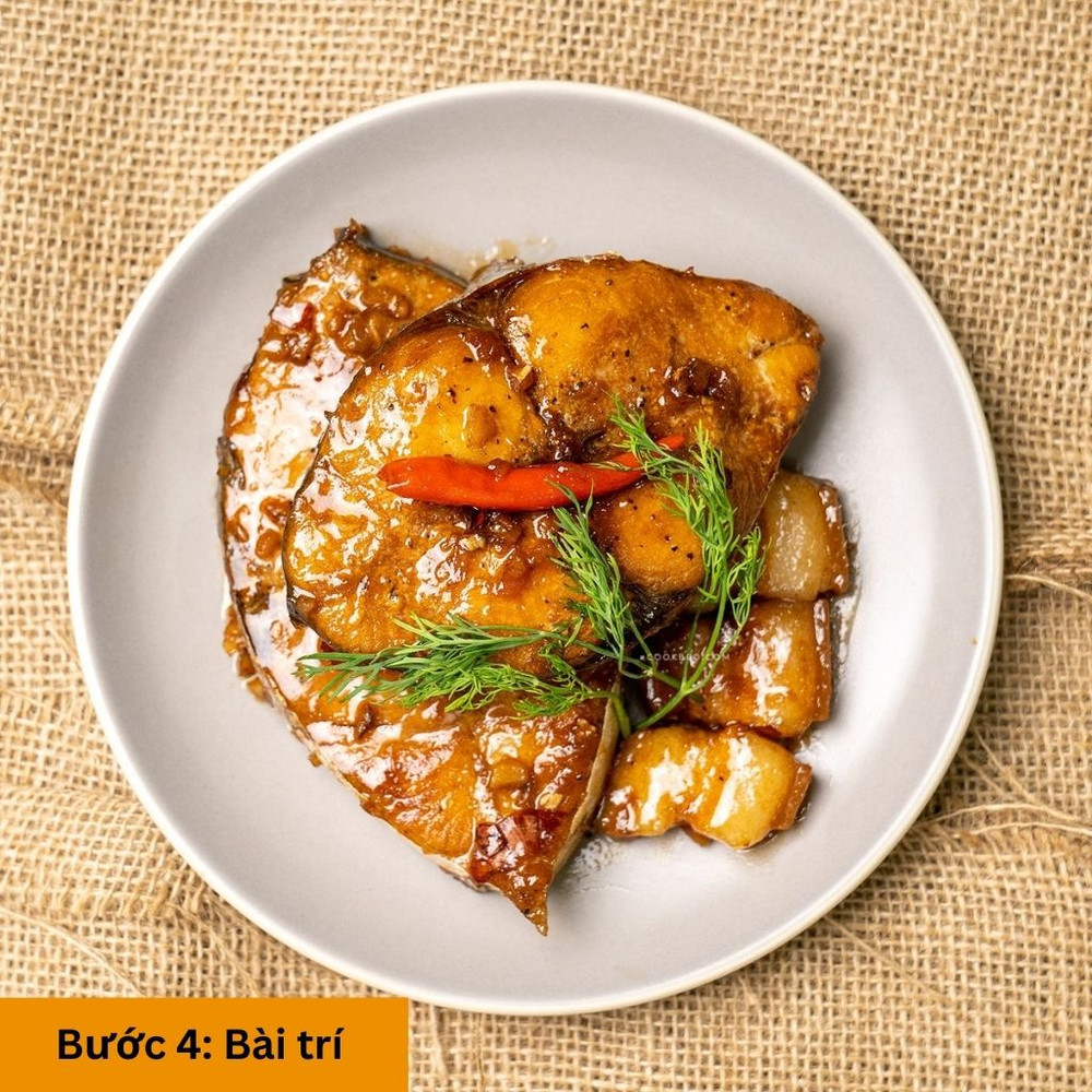 Khi nước trong nồi cạn dần và sệt lại, cá và thịt thấm đều gia vị tắt bếp, rắc thêm chút tiêu và hành lá để tăng hương vị.