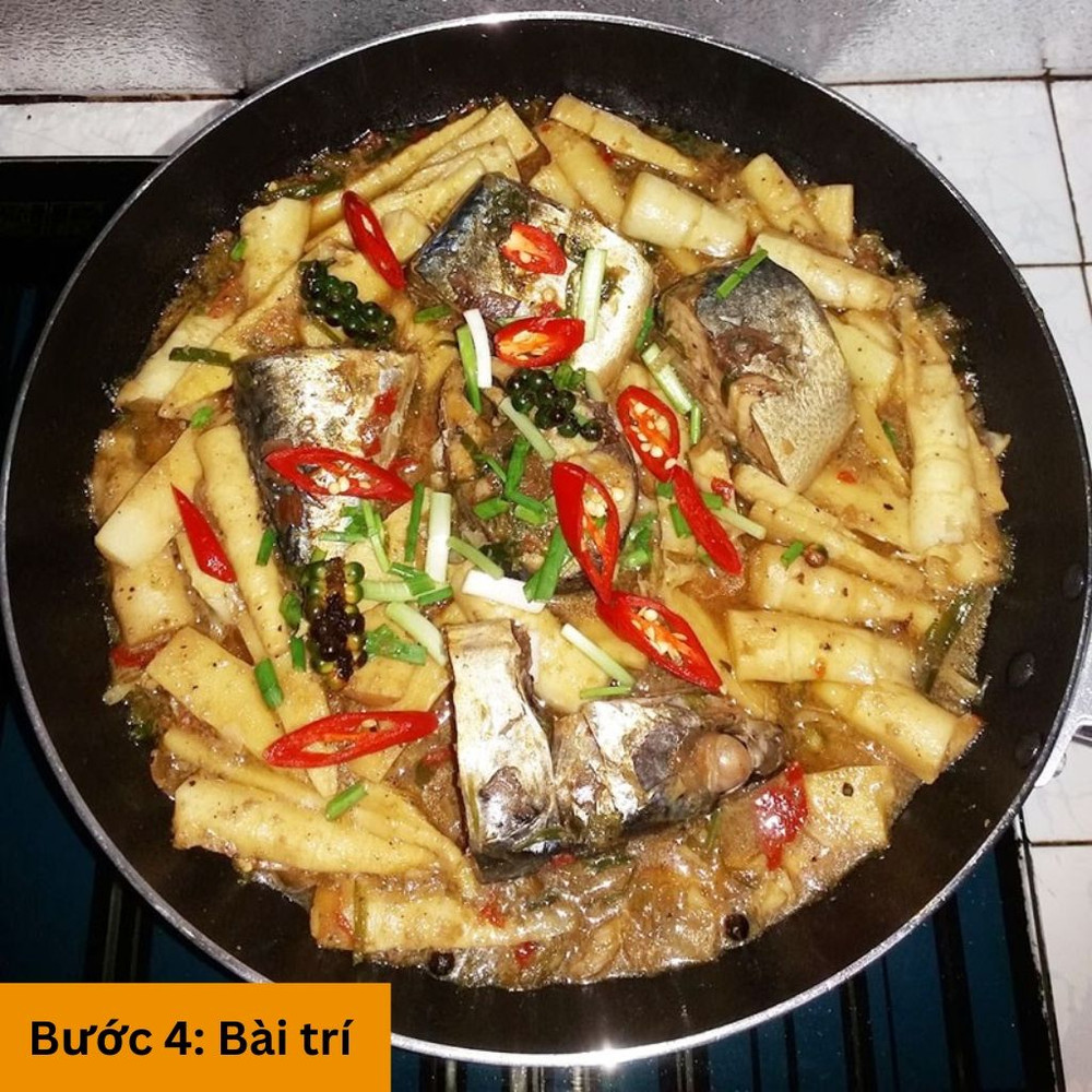 Phi thơm hành tím, tỏi băm, cho măng vào xào khoảng 2-3 phút cho thơm. Tiếp theo, cho cá đã chiên vào, đổ nước vừa đủ ngập cá. Hạ lửa nhỏ, kho khoảng 20-30 phút cho cá thấm gia vị, nêm thêm chút hạt nêm, nước mắm tiêu cho vừa ăn.
