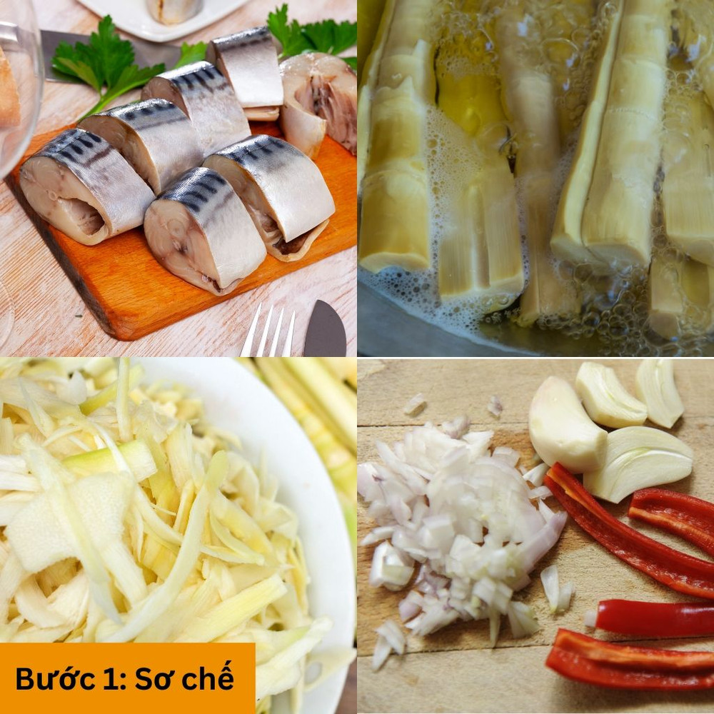 Cá mục rửa sạch để ráo. Măng tươi rửa sạch, luộc sơ qua với nước để loại bỏ vị chua và đắng, sau đó để ráo. Hành tím, tỏi băm nhỏ; ớt cắt lát.