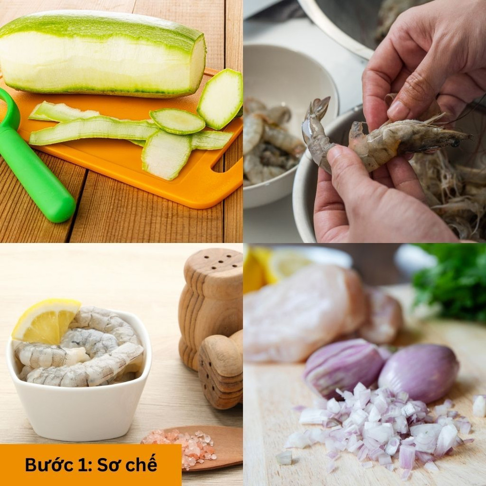 Bầu gọt vỏ, rửa sạch rồi cắt thành lát mỏng vừa ăn. Tôm lột vỏ, rút chỉ đen, rửa sạch. Sau đó ướp với một ít muối, tiêu và hạt nêm khoảng 10 phút. Hành tím bóc vỏ, băm nhỏ.