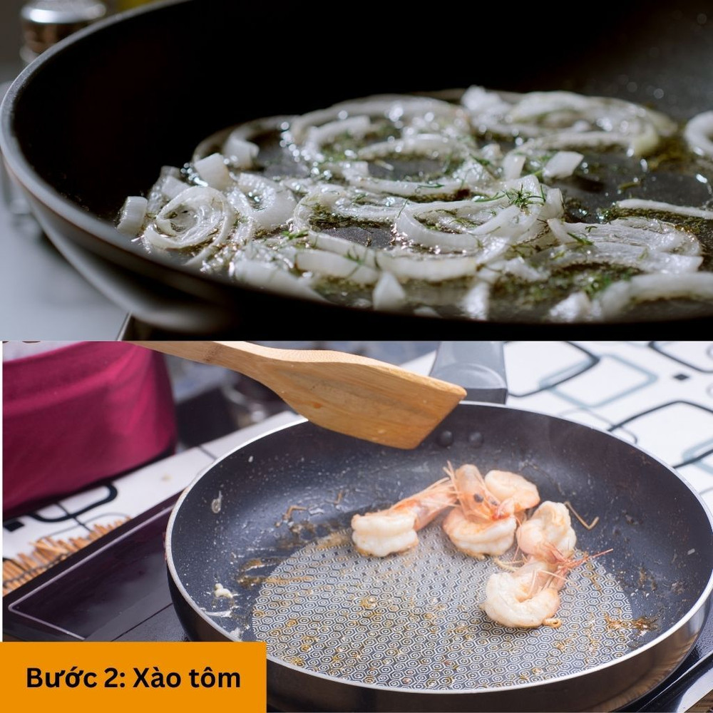 Làm nóng nồi với một ít dầu ăn, cho hành tím vào phi thơm. Cho tôm đã ướp vào xào đến khi tôm săn lại và có màu hồng đẹp.