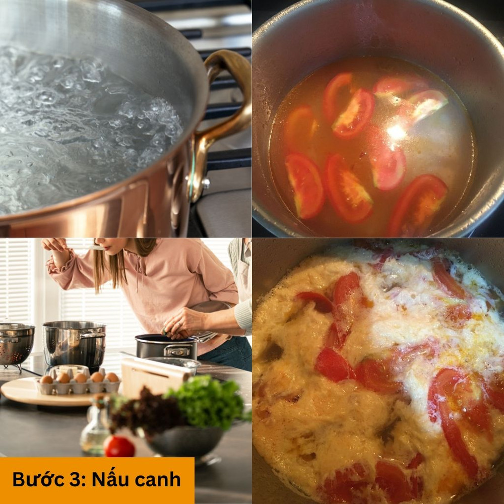 Đổ 600ml nước đun sôi, cho cà chua vào đun khoảng 5 phút cho chín nước canh có màu đẹp nêm nước mắm, muối, tiêu cho vừa ăn. Từ từ đổ trứng vào nồi, khuấy nhẹ để trứng tạo thành những sợi mỏng.