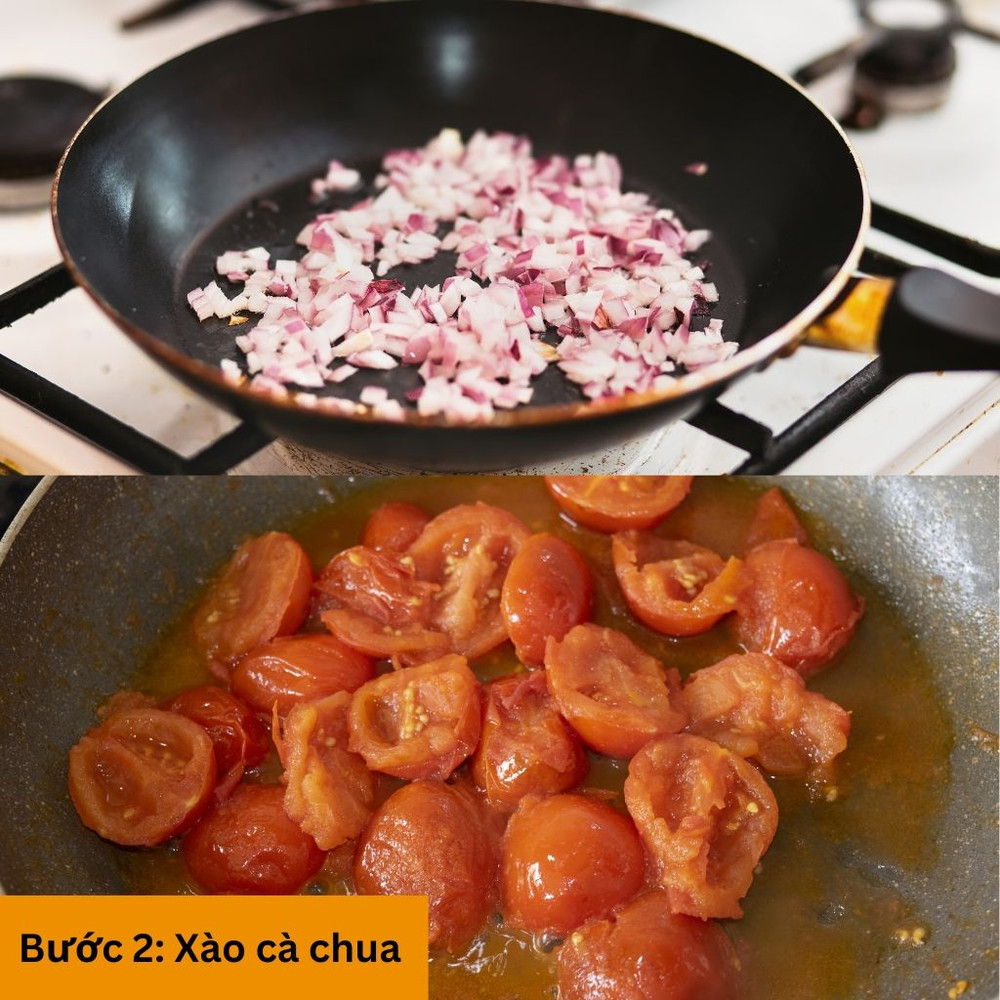 Đun nóng dầu ăn trong nồi, cho tỏi băm vào phi thơm. Thêm cà chua vào nồi, đảo đều cho cà chua mềm và ra nước.