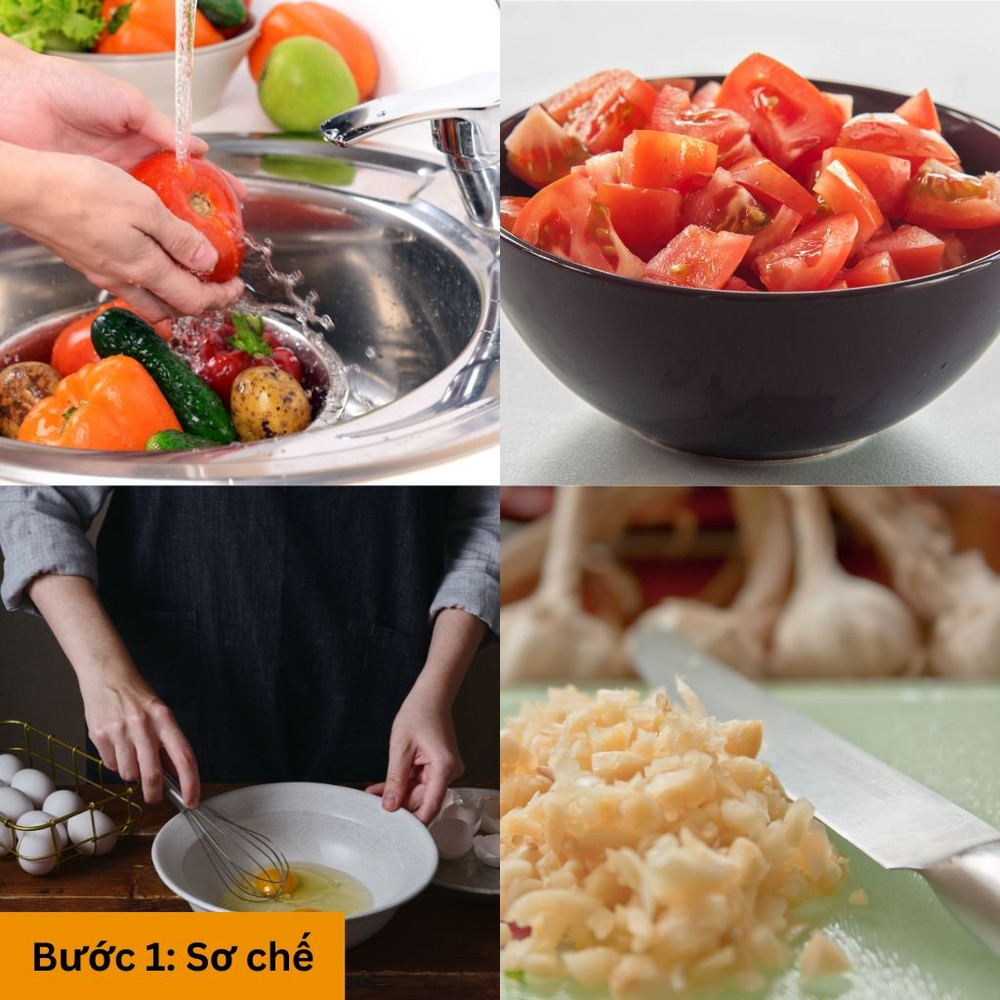 Cà chua rửa sạch, cắt thành miếng vừa ăn. Trứng đập ra chén đánh đều, tỏi băm nhỏ