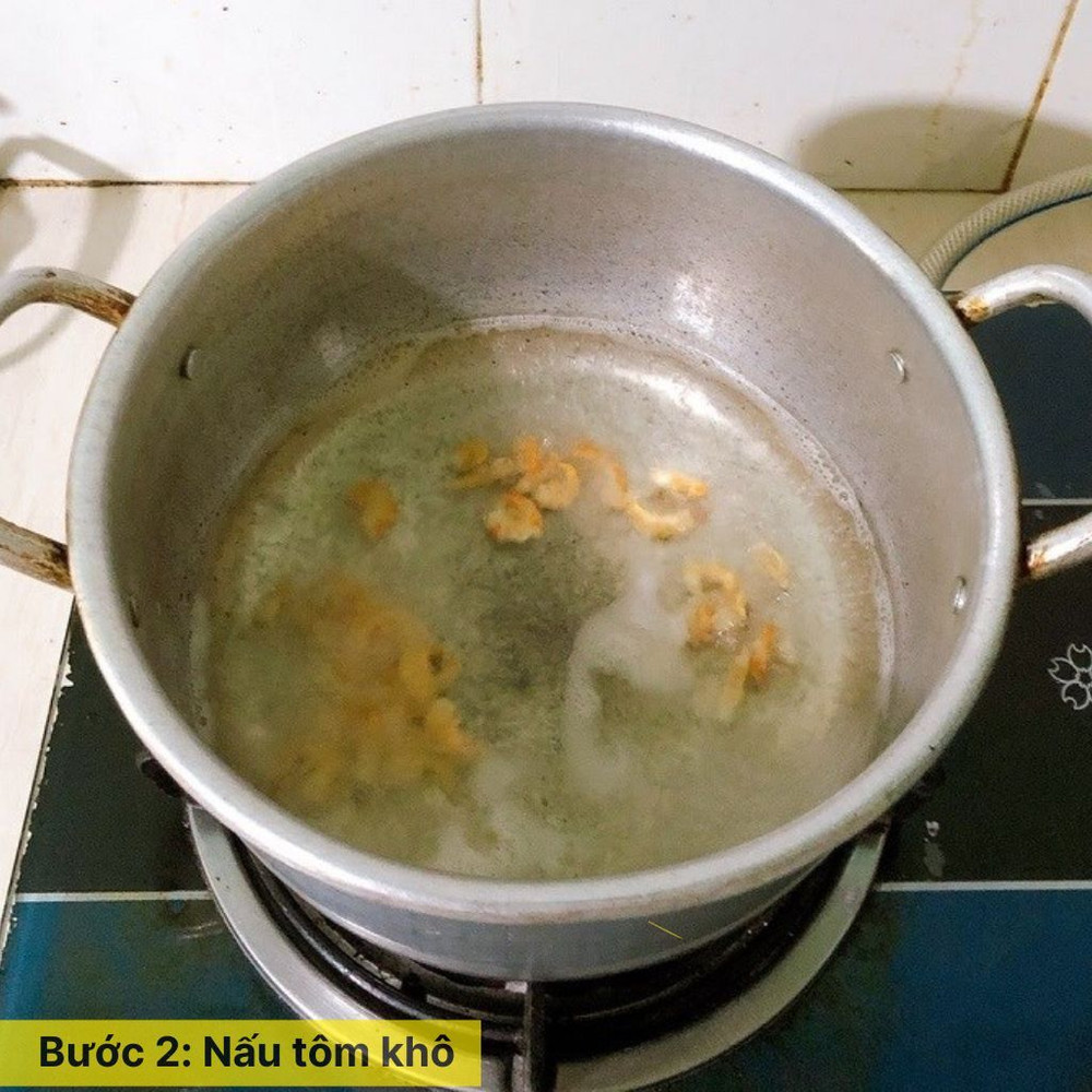 Đun nóng dầu ăn trong nồi, cho hành tím băm vào và phi đến khi thơm vàng và dậy mùi. Thêm tôm khô vào nồi, đảo đều cho đến khi săn lại và chín tới. Xào sơ giúp tôm ra vị ngọt, nước canh sẽ thơm ngon hơn.