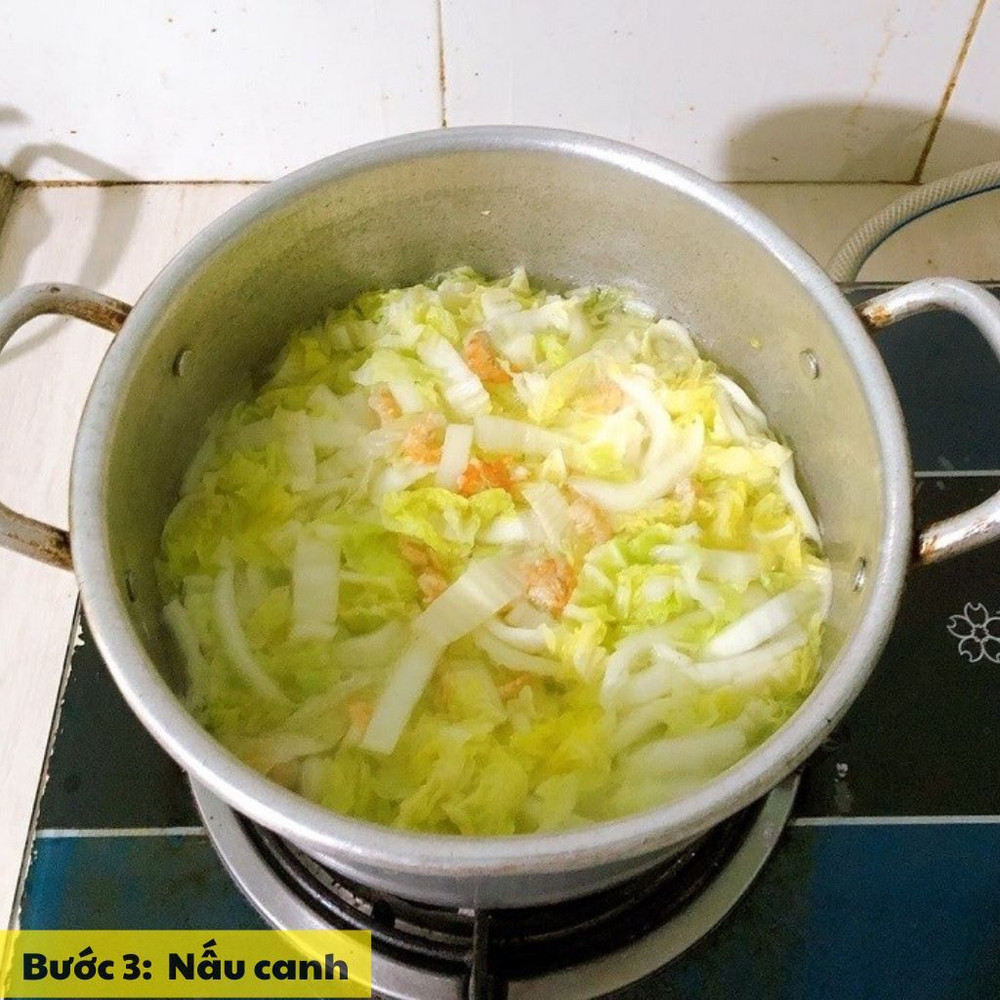 Đổ khoảng 1 lít nước vào nồi, đun sôi. Khi nước sôi, cho cải thảo vào, nấu với lửa vừa đến khi cải chín mềm nhưng không nhũn, giữ được độ giòn tự nhiên. Nêm nước mắm, hạt nêm và muối theo khẩu vị, đảo nhẹ để gia vị ngấm đều.