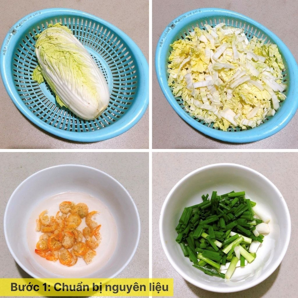 Rửa sạch cải thảo, sau đó cắt thành miếng vừa ăn. Hành lá rửa sạch, thái nhỏ. Rửa sạch 50g tôm khô, bóc vỏ, làm sạch và ướp nhẹ với muối.