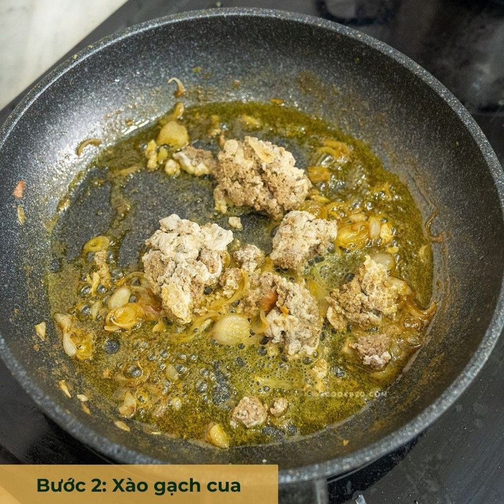 Để chảo lên bếp, cho dầu ăn vào phi thơm hành tím, sau đó cho gạch cua vào xào nhanh và để riêng.