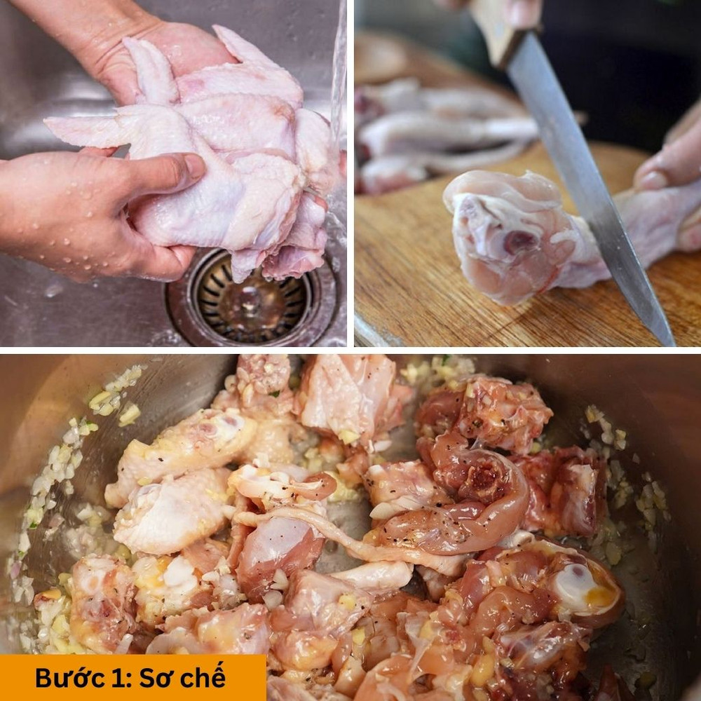 Rửa sạch thịt gà, chặt thành miếng vừa ăn. Ướp gà với một chút muối, tiêu, hạt nêm và hành tím băm