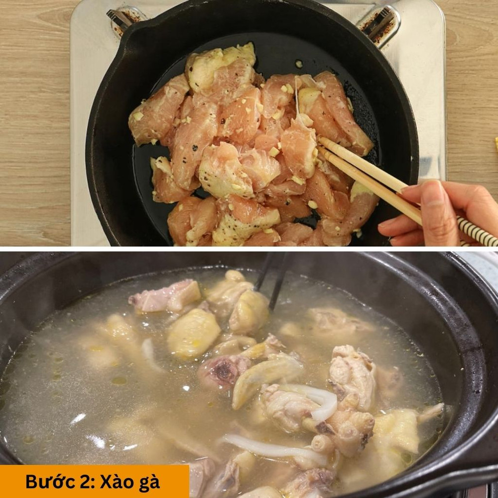 Đun nóng dầu ăn trong nồi, cho gà vào xào săn lại. Sau đó đổ nước lọc vào đun sôi, hạ nhỏ lửa đến khi gà chín mềm (khoảng 15 – 20 phút)