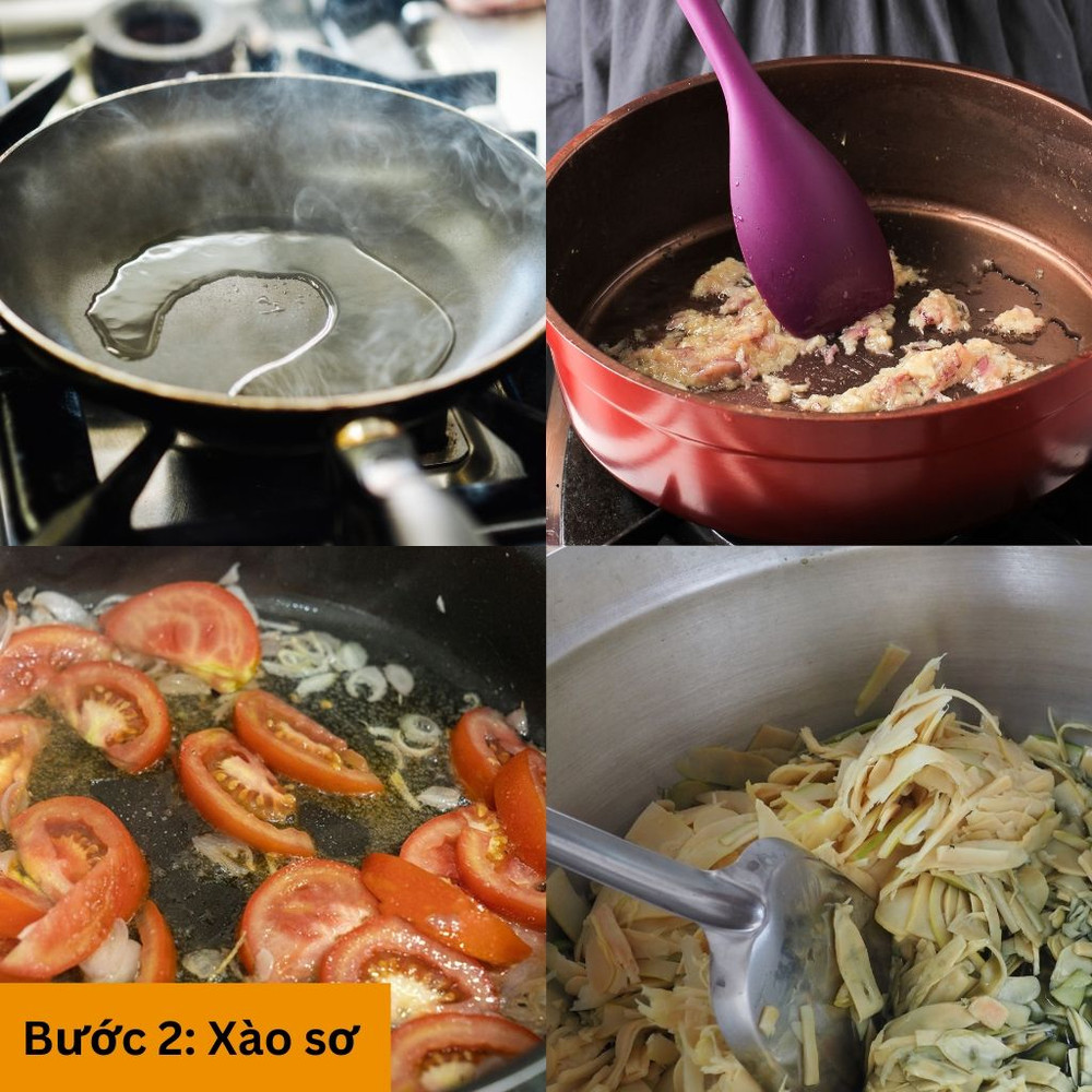 Phi thơm hành tỏi băm với chút dầu ăn. Cho măng và cà chua và cà chua xào sơ, nêm chút muối, hạt nêm để thấm gia vị.