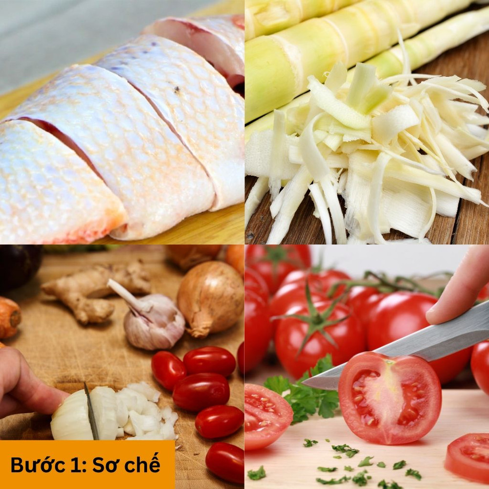 Măng chua rửa sạch, cắt nhỏ. Cà chua rửa sạch cắt miếng vừa ăn, hành tím, tỏi băm nhỏ.