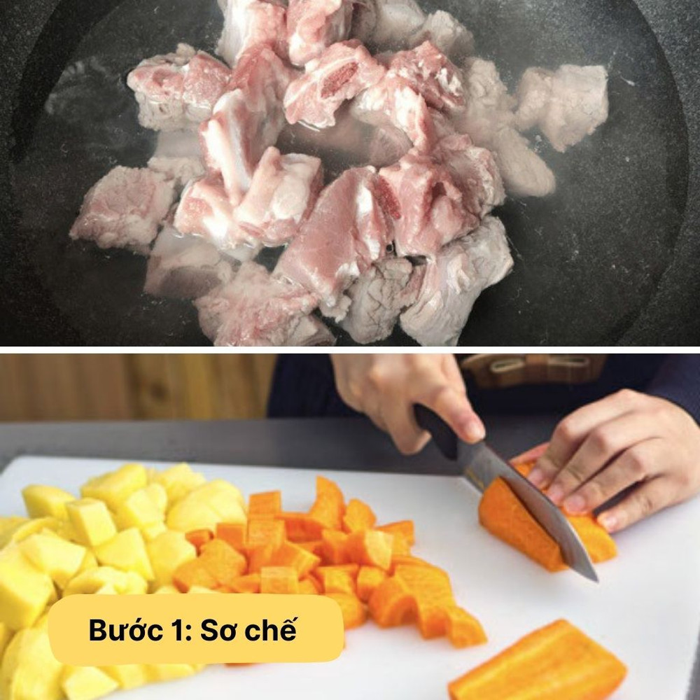 Xương heo rửa sạch cùng nước muối, sau đó chần qua nước sôi để loại bỏ mùi hôi. Cà rốt, khoai tây nạo bỏ vỏ, cắt miếng vừa ăn, rửa sạch