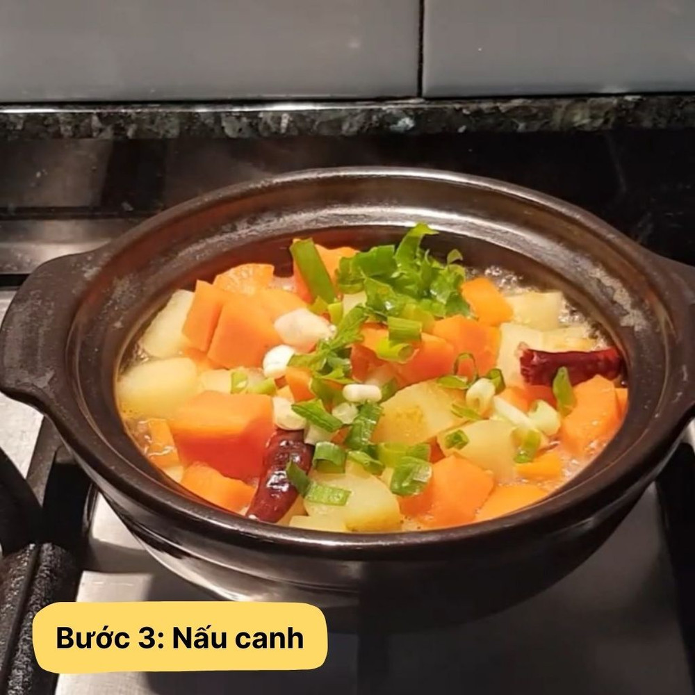 Sau khi xương hầm được 15 phút, thêm cà rốt và khoai tây vào hầm cùng thêm 10 phút