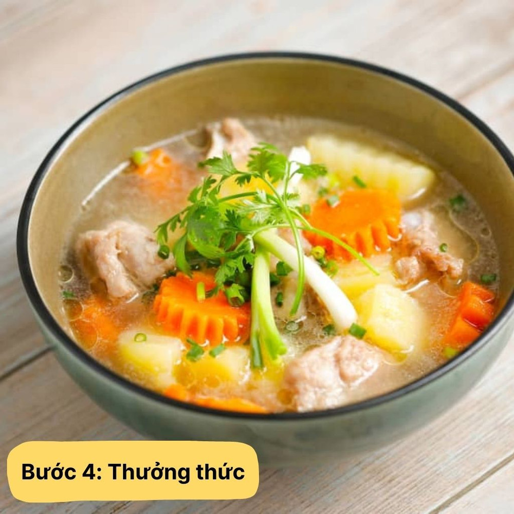 Khi rau củ cùng xương đã mềm, nước dùng ngọt thanh, cắt nhỏ hành và ngò nêm vào rồi thưởng thức
