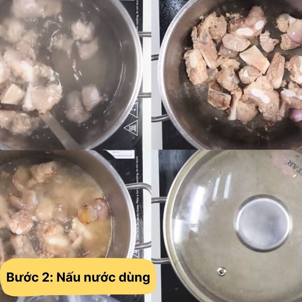 Cho 1 muỗng dầu ăn, phi thơm hành, xào qua xương, nêm 1 muỗng canh hạt nêm và 1 muỗng canh bột ngọt. Cho 1,5l nước vào hầm với lửa nhỏ 15 phút