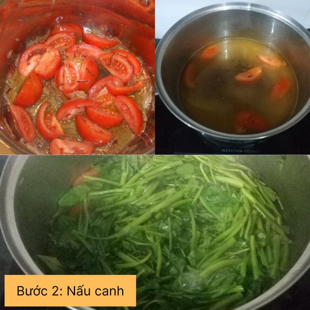 Bắc nồi, phi dầu rồi xào 2 trái cà chua 3 phút. Thêm 500ml nước, nước cốt me, 3 muỗng nước mắm, 1 muỗng hạt nêm, 1/2 muỗng bột ngọt, nấu lửa lớn 7-10 phút. Thêm 300g rau muống, nấu 3 phút, nêm vừa ăn, tắt bếp.