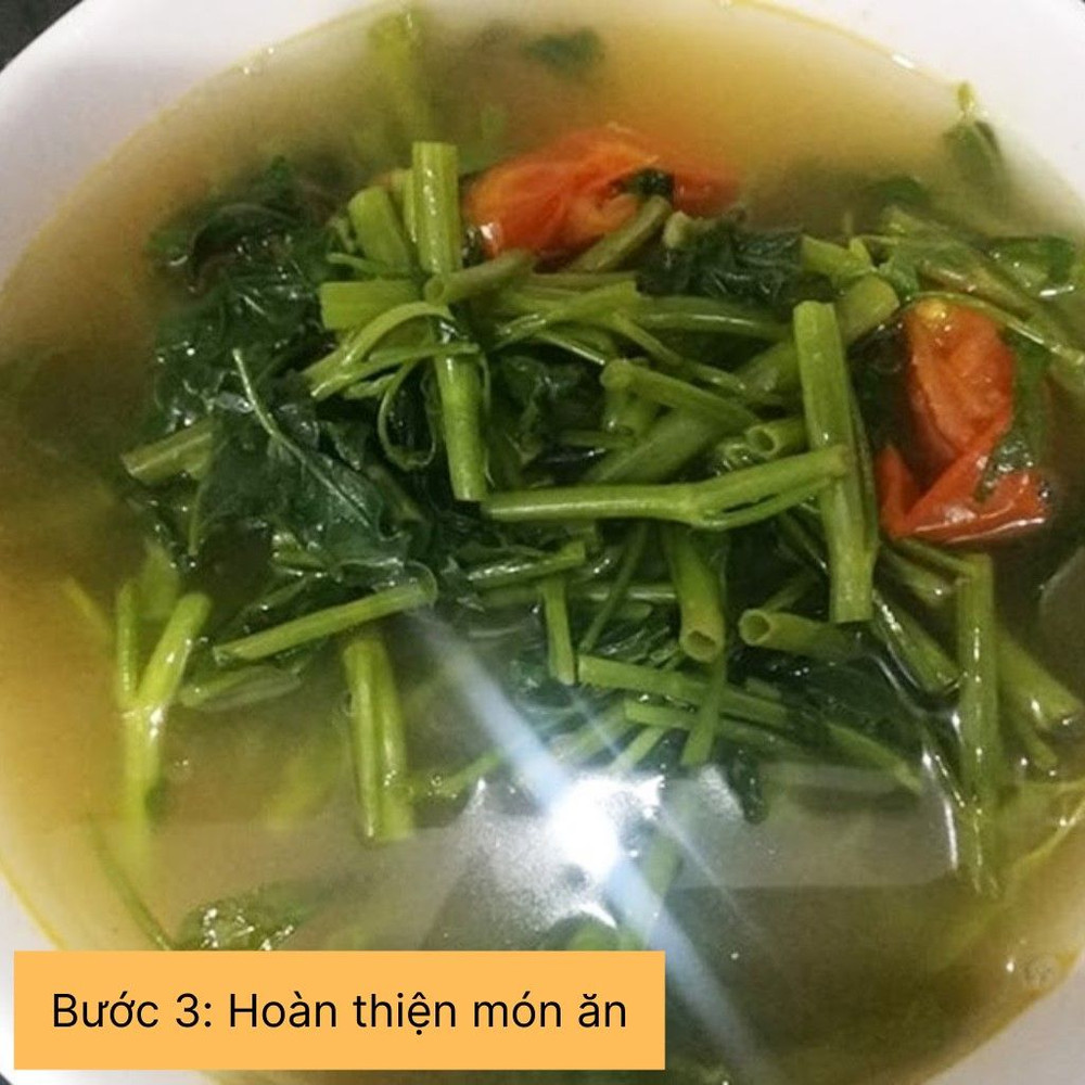 Múc canh rau muống cà chua ra tô. Thưởng thức nóng với cơm hoặc bún đều rất ngon miệng.