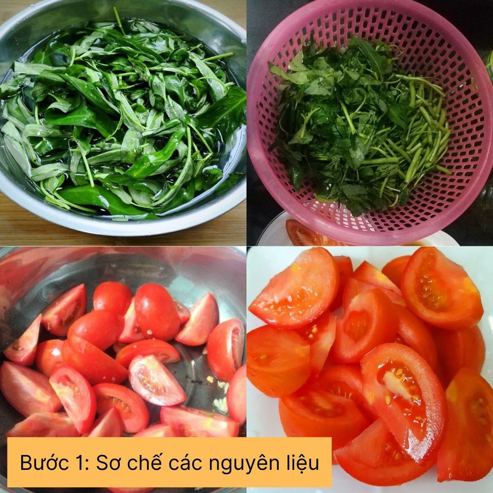Lặt 300g rau muống, rửa sạch, để ráo. Rửa cà chua, cắt múi cau. Ngâm 10g me vắt với 100ml nước ấm trong 10 phút, vớt bỏ xác me, lấy nước cốt.