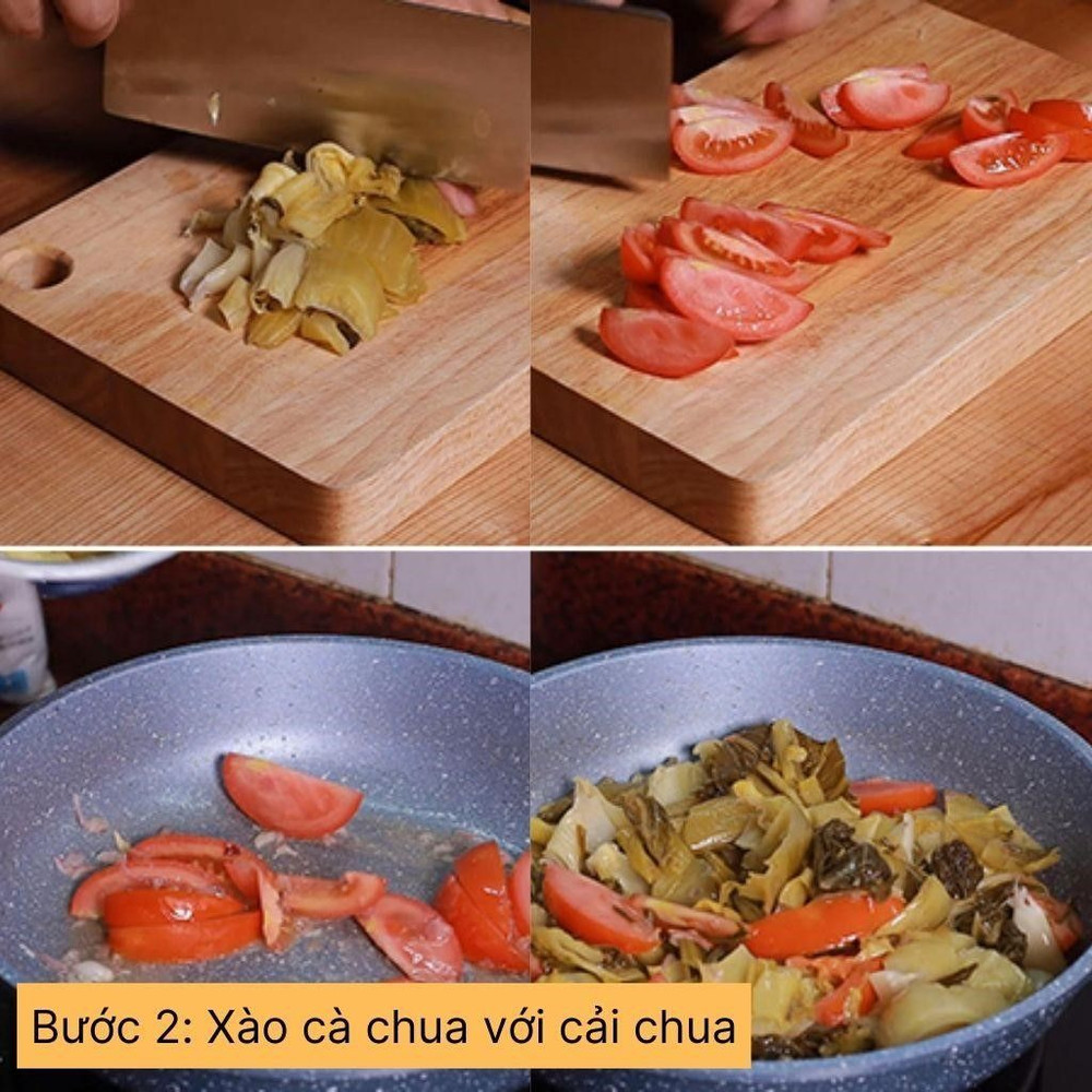 Trong khi hầm xương, cắt nhỏ cà chua và cải chua. Sau đó phi thơm hành tím với dầu ăn, rồi cho cà chua và cải chua vào xào cho chín mềm.