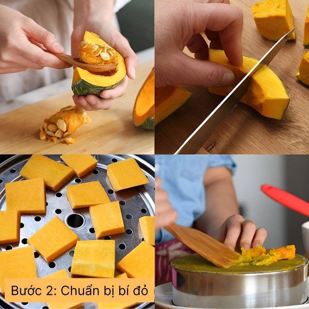 Trong khi đó, bí đỏ gọt vỏ, rửa sạch, cắt miếng nhỏ và hấp chín, sau đó nghiền nhuyễn.
